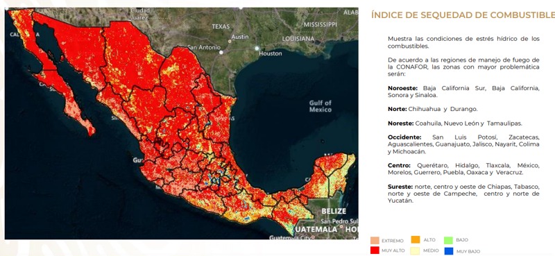 De acuerdo con la CONAFOR por la densidad de puntos de calor, en los próximos diez días, las zonas con mayor problemática serán, en el Noroeste: noroeste de Baja California, este de Sonora y este de Sinaloa. Norte: centro de Chihuahua y oeste de Durango. Noreste: centro de Coahuila, centro y norte de Nuevo León, Tamaulipas. Occidente: este de San Luis Potosí, sur de Guanajuato, suroeste de Zacatecas, Nayarit, Jalisco, Colima y Michoacán. Centro: sur de Querétaro, sur y norte de Hidalgo, Tlaxcala, México, Morelos, Guerrero, Puebla, Oaxaca y Veracruz. Sureste: Chiapas, Tabasco, Campeche, Quintana Roo y Yucatán.
