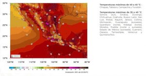 Se presentarán temperaturas máximas de 35 a 40 °C en: Sonora (sur), Sinaloa, Durango, Chihuahua, Coahuila, Nuevo León, San Luis Potosí, Nayarit, Jalisco, Colima, Michoacán, Guanajuato (suroeste), Querétaro (norte), Hidalgo (norte), Morelos, Puebla (norte y suroeste), Estado de México (suroeste), Guerrero, Oaxaca, Tamaulipas, Veracruz y Quintana Roo.