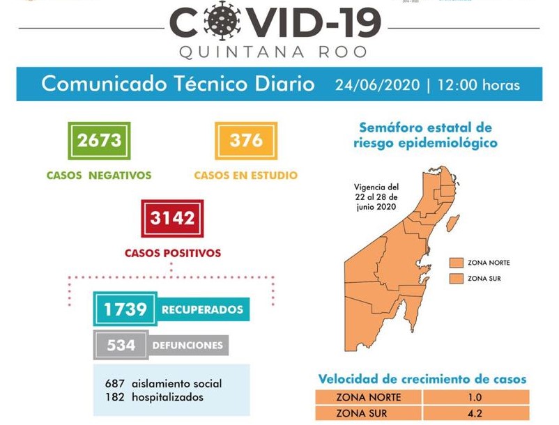 Hasta las 12 horas del 24 de junio, se han notificado 2673 casos negativos, 376 en estudio, 3142 positivos, 534 defunciones y 1739 personas recuperadas a Covid 19″, informó la Secretaría de Salud en Quintana Roo. Ayer la cifra estaba en 3011.