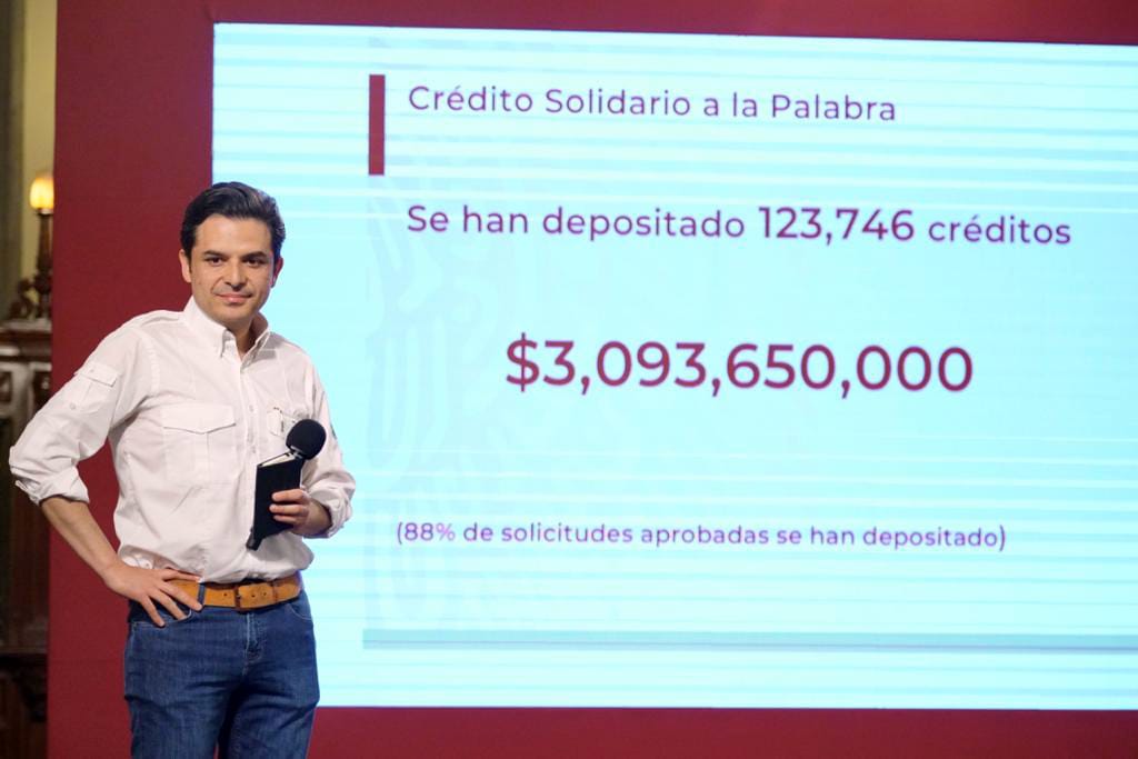Zoé Robledo informó que al corte del 11 de mayo a las 13:00 horas, 141 mil 965 personas han solicitado el Crédito Solidario a la Palabra que pagarán a partir del cuarto mes con una tasa interbancaria del seis al 10 por ciento.