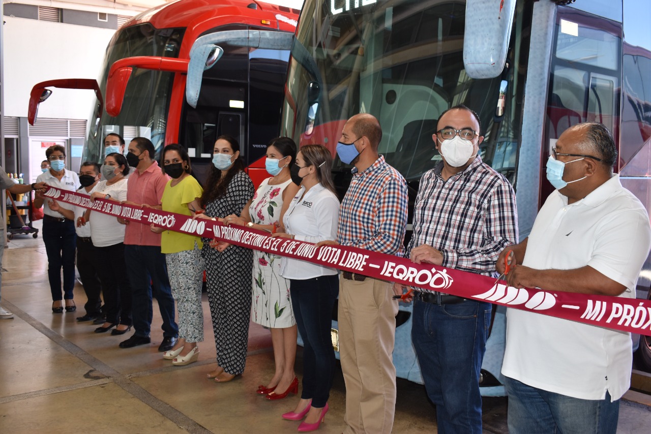La Consejera Presidenta del Instituto Electoral de Quintana Roo (IEQROO), Mayra San Román Carrillo Medina, acompañada de la Consejera Electoral y Presidenta de la Comisión de Comunicación Social, Maisie Lorena Conteras Briceño, en alianza y colaboración con el Gerente de la empresa ADO Chetumal, Juan Manuel Díaz Zamora, pusieron en marcha la tercera edición de la campaña: “Mi próximo destino es el 5 de junio, vota libre”.