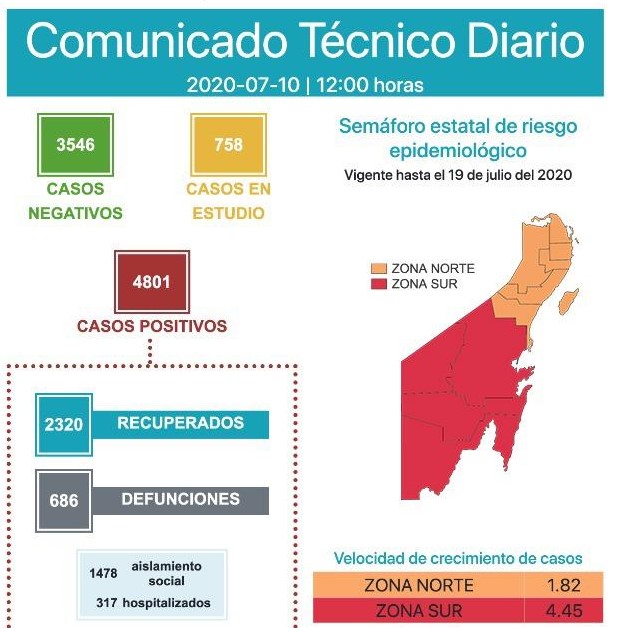 Chetumal, Q. Roo, Viernes 10 de Julio de 2020, poderycrítica.- «Hasta las 12 horas del 10 de julio, se han notificado 3,546 casos negativos, 758 en estudio, 4,801 positivos, 686 defunciones y 2,320 personas recuperadas a COVID-19», informó este día la Secretaría de Salud.