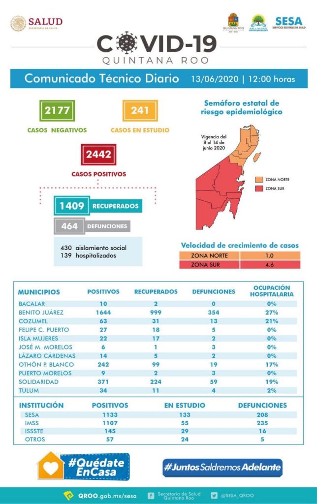 «Hasta las 12 horas del 13 de junio, se han notificado 2177 casos negativos, 241 en estudio, 2442 positivos, 464 defunciones y 1409 personas recuperadas a Covid-19», informó Alejandra Aguirre Crespo, secretaria estatal de Salud.