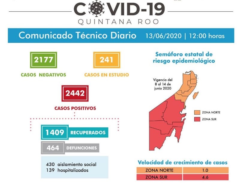 Chetumal, Q. Roo, Sábado 13 de Junio de 2020, poderycrítica.- 2 mil 422 es la cifra positiva de casos de coronavirus en Quintana Roo.