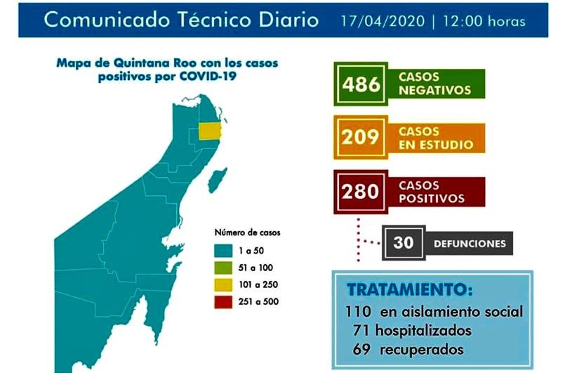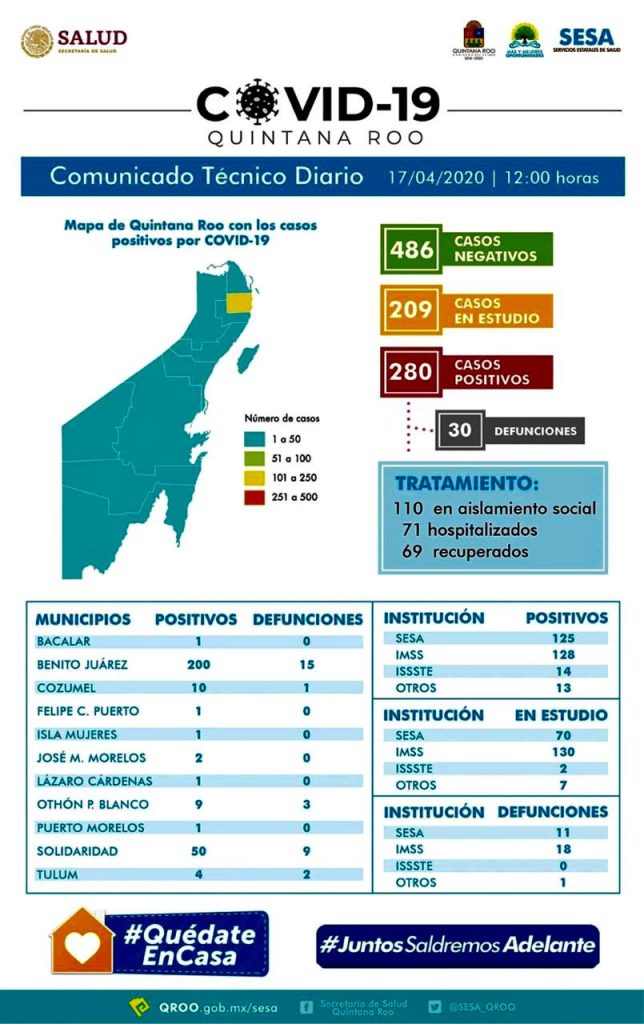 Chetumal, Q. Roo, Viernes 17 de Abril de 2020, poderycrítica.- Un total de 280 personas han sido reportadas como positivas de coronavirus en Quintana Roo.