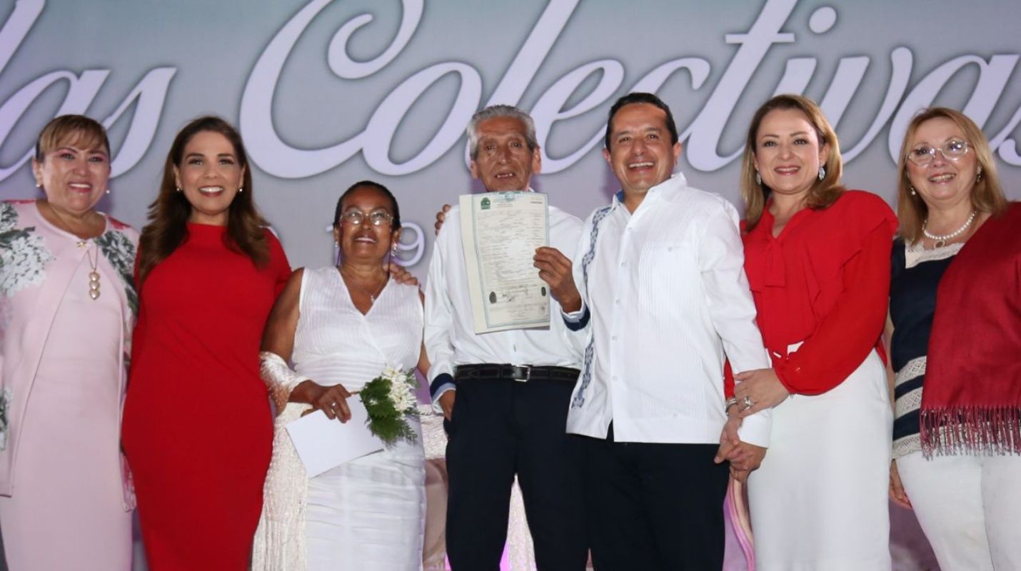 Acompañado por la presidenta del DIF estatal Gabriela Rejón de Joaquín y la presidenta municipal de Benito Juárez María Elena Lezama, el gobernador Carlos Joaquín felicitó a las parejas contrayentes señalando que, al formalizar su unión a través de un documento, tendrán certeza jurídica y los hijos puedan acceder a la educación y a tener un mejor futuro.