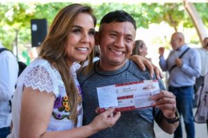 Mara Lezama estuvo acompañada del delegado del Programa para Desarrollo del Estado, Arturo Abreu Marín; la presidenta municipal de Benito Juárez, Ana Paty Peralta De la Peña, y del secretario de Bienestar, Pablo Bustamante Beltrán.