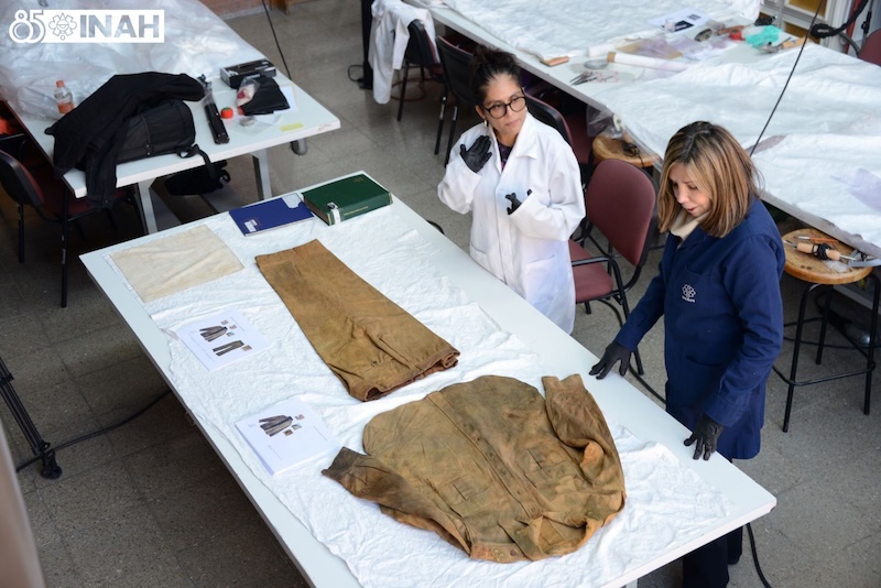 La camisa y el pantalón se encuentran en las instalaciones de la ENCRyM, donde se ha concluido la reintegración de los faltantes en las prendas, con la colocación de injertos de gabardina de algodón, teñidos a tono; posteriormente, se iniciará un proceso de reintegración cromática para unificar las intervenciones.