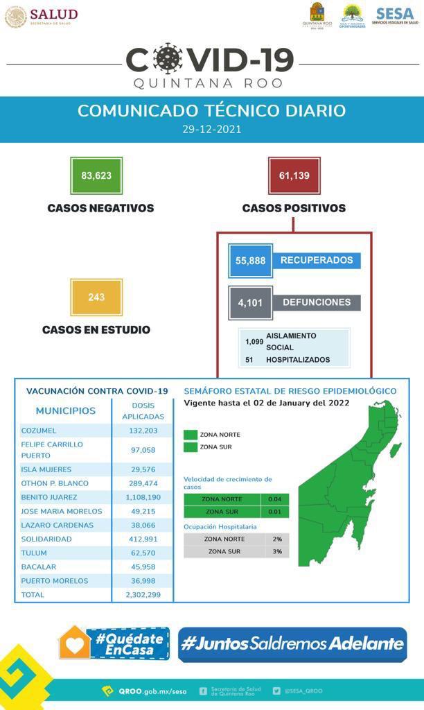 Los municipios que presentan un aumento de contagios por COVID19 son Isla Mujeres con un 27 por ciento, Benito Juárez con un alarmante aumento del 97 por ciento, así como Bacalar que presenta un incremento del 150 por ciento, y el municipio de Solidaridad que presenta un repunte de casos del 335 por ciento.