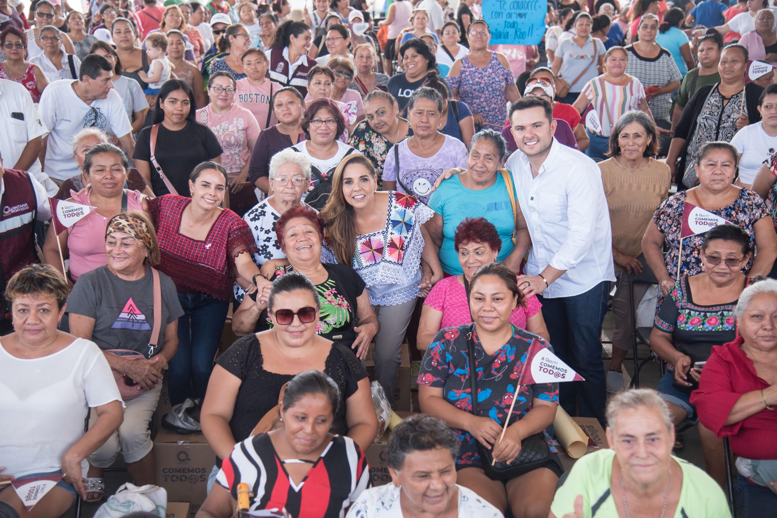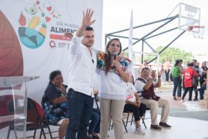 Ante cientos de beneficiari@s de «Comemos Tod@s», reunidos en el Toro Valenzuela de Cancún, la Gobernadora Mara Lezama, acompañada del secretario Pablo Bustamante, entregó, de mano en mano, paquetes alimentarios, en el marco del Día Mundial de la Alimentación.