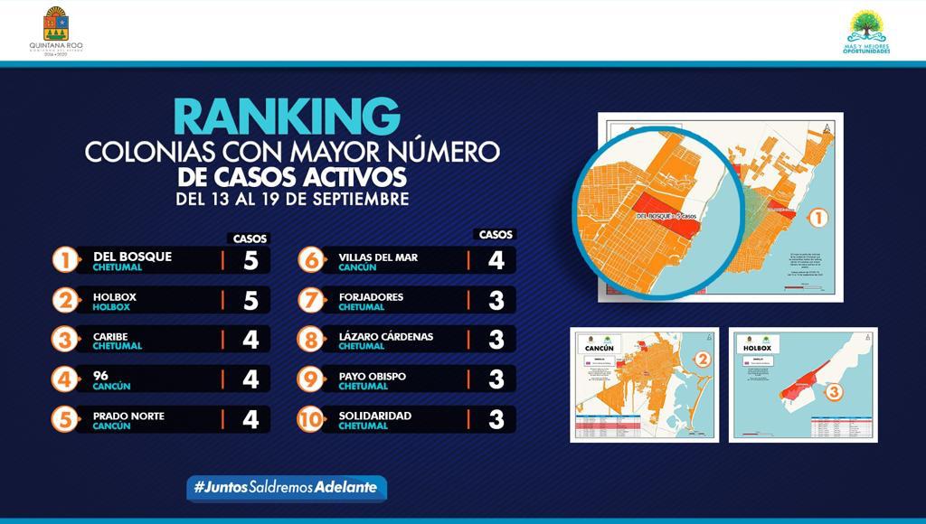 La colonia con más casos es la Del Bosque en la ciudad de Chetumal que reporta cinco personas contagiadas, la isla de Holbox con cinco casos, colonia Caribe en el municipio de Othón P. Blanco con 4 casos, la región 96 en la ciudad de Cancún con 4 casos, la colonia Prado Norte también en la ciudad de Cancún con 4 casos, la colonia Villas del Mar con 4 casos, Forjadores con 3, la colonia Lázaro Cárdenas con 3, la colonia Payo Obispo con 3 y la colonia Solidaridad con 3 casos.