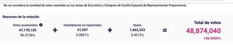 El total de votos fue de 48 millones 874 mil 40 registrados de la siguiente manera: 47 millones 170 mil 120 votos acumulados que representan el 96.5136% de la elección, 41 mil 597 (0.0851%) votos emitidos a candidaturas no registradas y un millón 662 mil 323 votos anulados, es decir el 3.4012 de la elección.