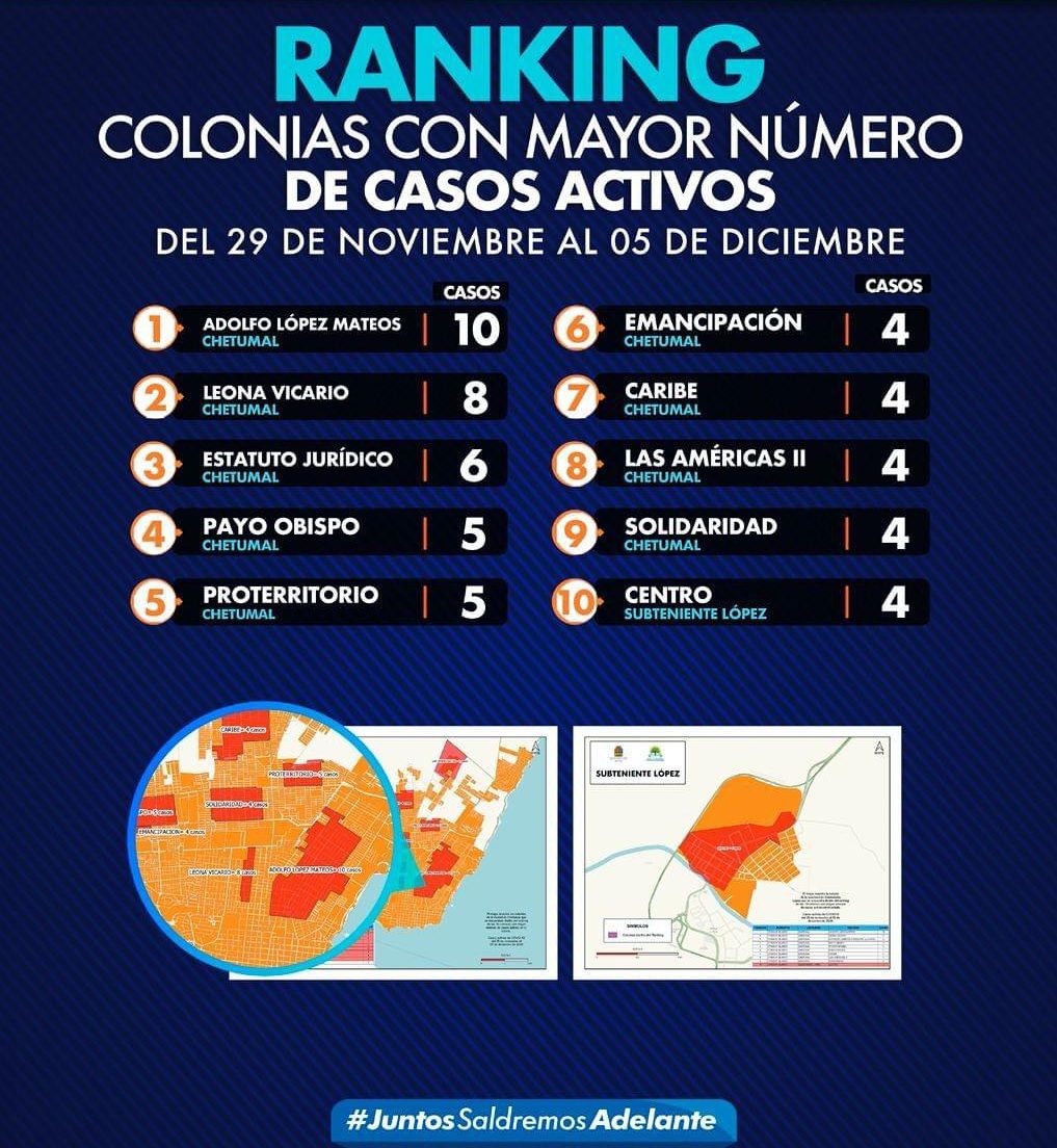 1.- La colonia Adolfo López Mateos en Chetumal con 10 casos activos.