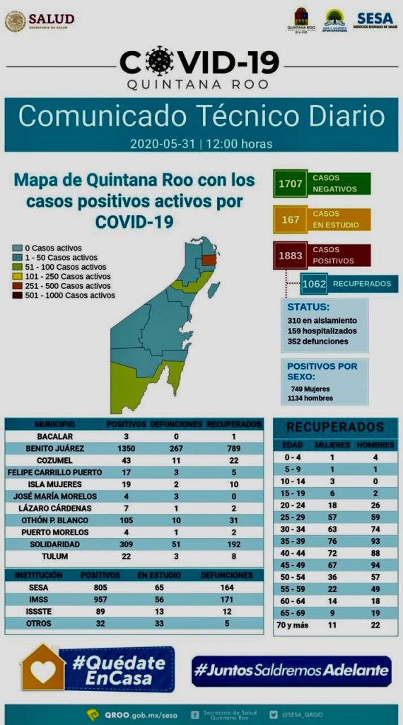 Chetumal, Q. Roo, Domingo 31 de Mayo de 2020, poderycrítica.- A un día para el regreso de Quintana Roo a las actividades esenciales, como es el caso de la industria de la construcción, hasta las 12 horas del 31 de mayo, se han notificado mil 707 casos negativos, 167 en estudio, mil 883 positivos, 352 defunciones y mil 62 personas recuperadas a Covid-19.