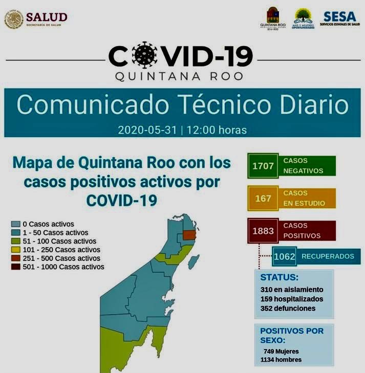Chetumal, Q. Roo, Domingo 31 de Mayo de 2020, poderycrítica.- A un día para el regreso de Quintana Roo a las actividades esenciales, como es el caso de la industria de la construcción, hasta las 12 horas del 31 de mayo, se han notificado mil 707 casos negativos, 167 en estudio, mil 883 positivos, 352 defunciones y mil 62 personas recuperadas a Covid-19.
