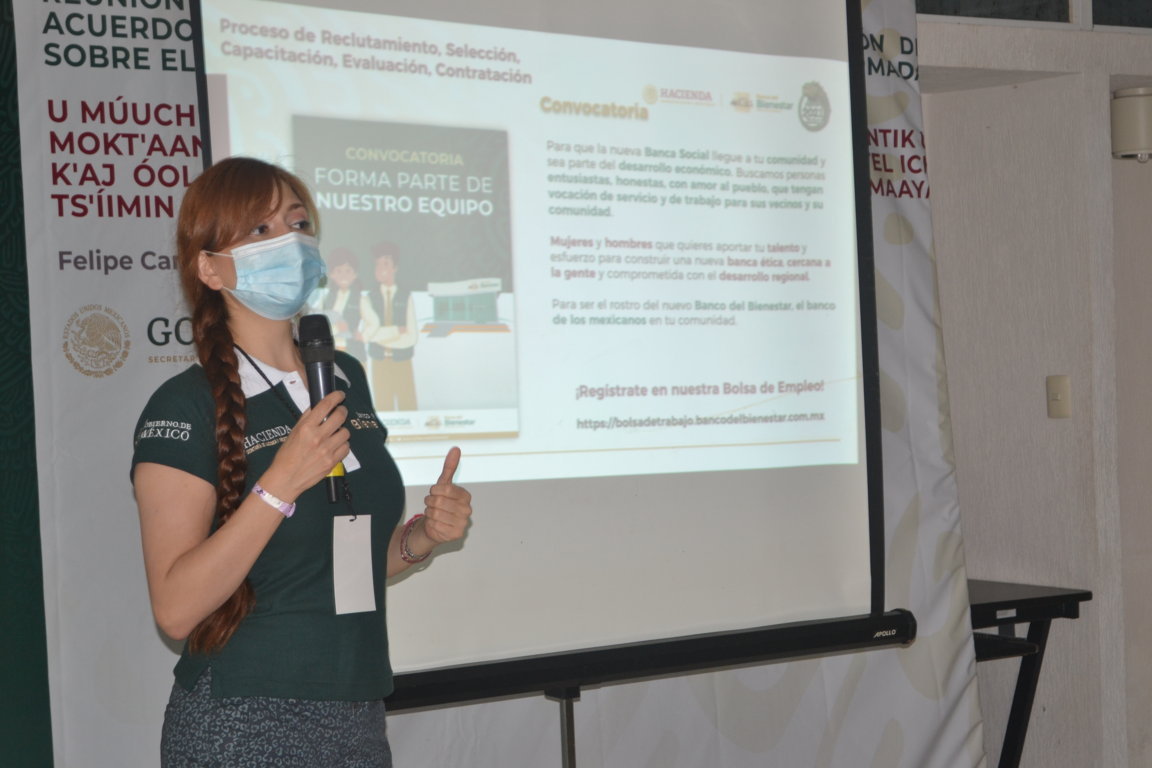 La representante del Banco del Bienestar expresó a los integrantes de la Comisión de Seguimiento del proyecto Tren Maya en el municipio de Felipe Carrillo Puerto la invitación para que sus familiares y conocidos de sus comunidades rurales postulen a las diversas áreas laborales que se encuentran ofertando a través de proceso de reclutamiento.