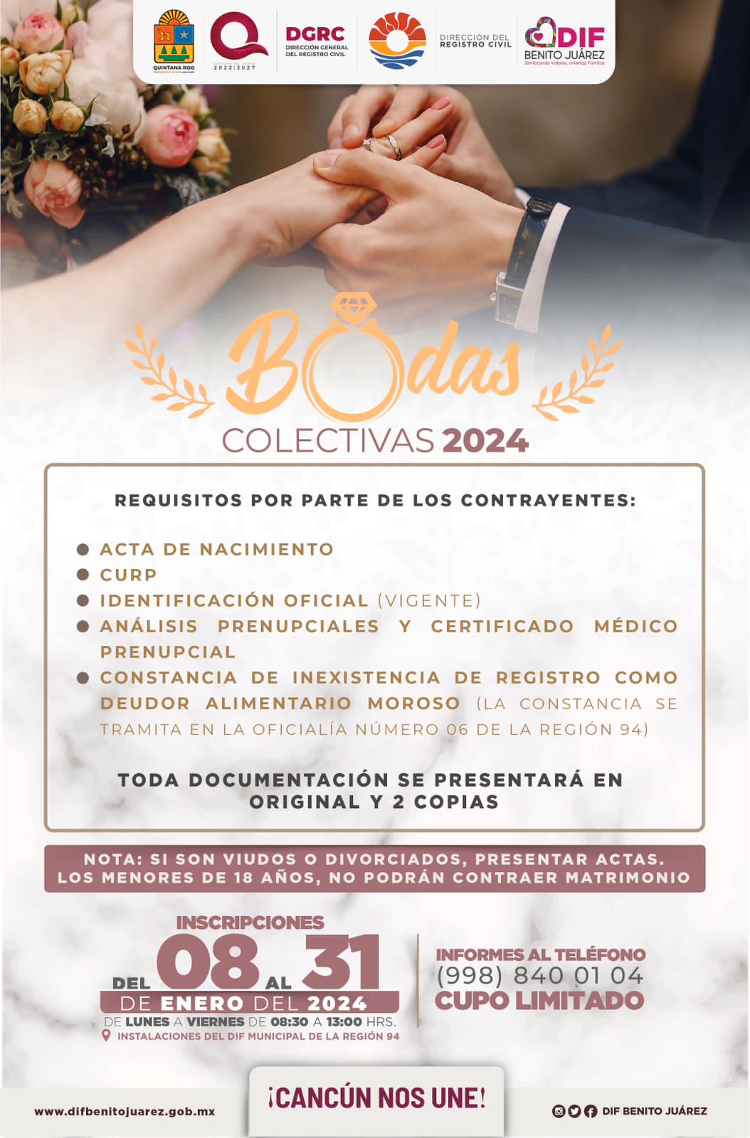 Indicó que la recepción nupcial se celebrará el próximo 14 de febrero y los requisitos que deberán presentar para contraer nupcias son el acta de nacimiento con vigencia de 5 años atrás, identificación oficial vigente, la Clave Única de Registro de Población (CURP) ambos contrayentes así como los análisis prenupciales y certificado médico prenupciales y constancia de inexistencia de registro como deudor alimentario moroso (este documento se tramita en la Oficialía Número 06 de la Supermanzana 94). Toda documentación deberán presentarla en original y 2 copias para su cotejo.