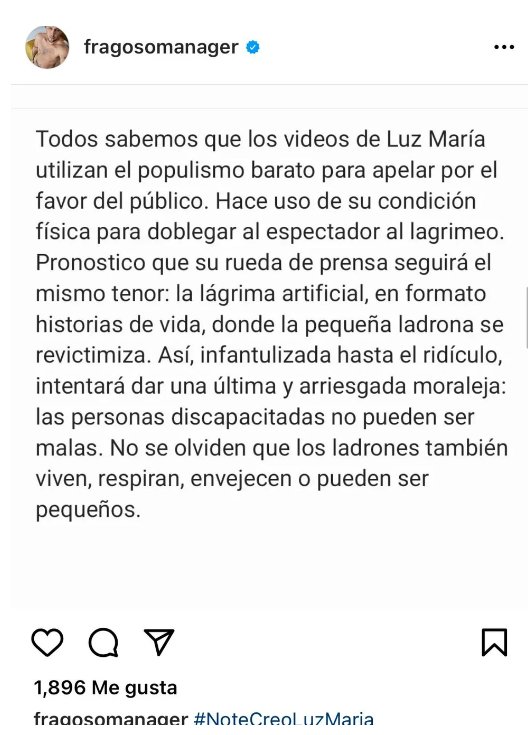 “Todos sabemos que los videos de Luz María utilizan el populismo barato para apelar por el favor del público. Hace uso de su condición física para doblegar al espectador al .