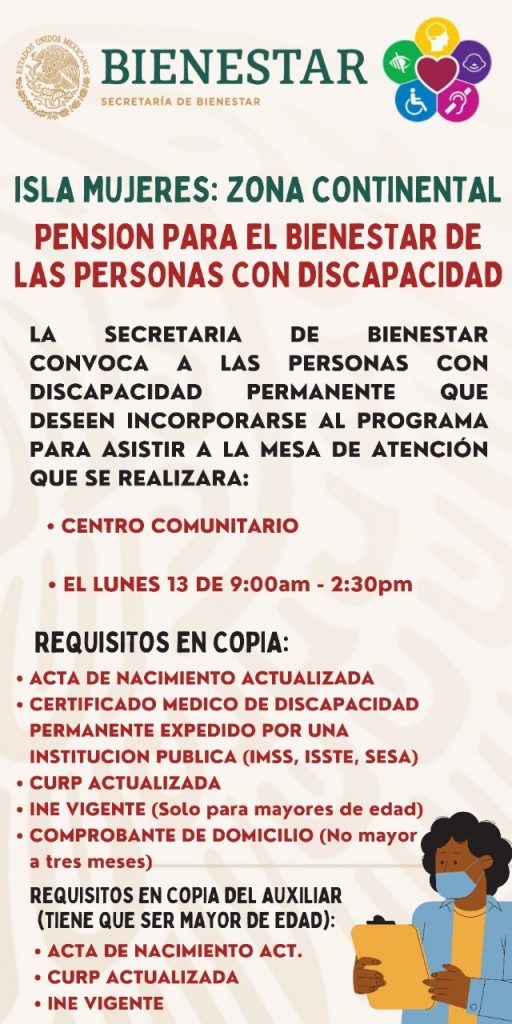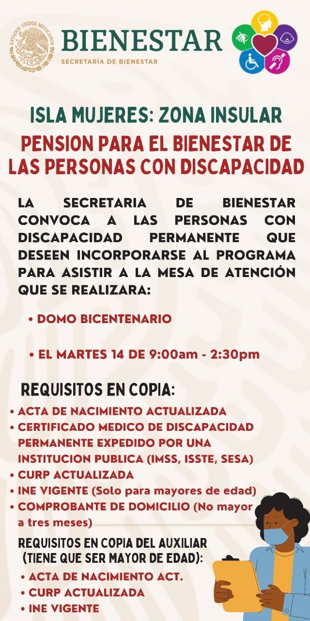 Agregó que la Secretaría del Bienestar, convoca también a las personas con discapacidad permanente que deseen incorporarse al programa «Pensión para el Bienestar de las Personas con Discapacidad», a acudir a estas mesas de atención los días 13 y 14 de este mes en el horario y lugar antes mencionado, para su registro a dicho programa.