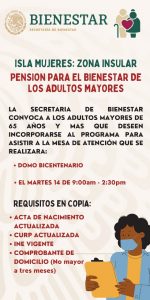 Cancún, Q. Roo, Domingo 12  de Septiembre de 2021, poderycrítica.-  Con el fin de que más abuelitos de Isla Mujeres se vean beneficiados con el programa «Pensión para el Bienestar de los Adultos Mayores», el gobierno federal en coordinación con el municipio isleño, abrirá una mesa de atención tanto en la ínsula como en la Zona Continental.