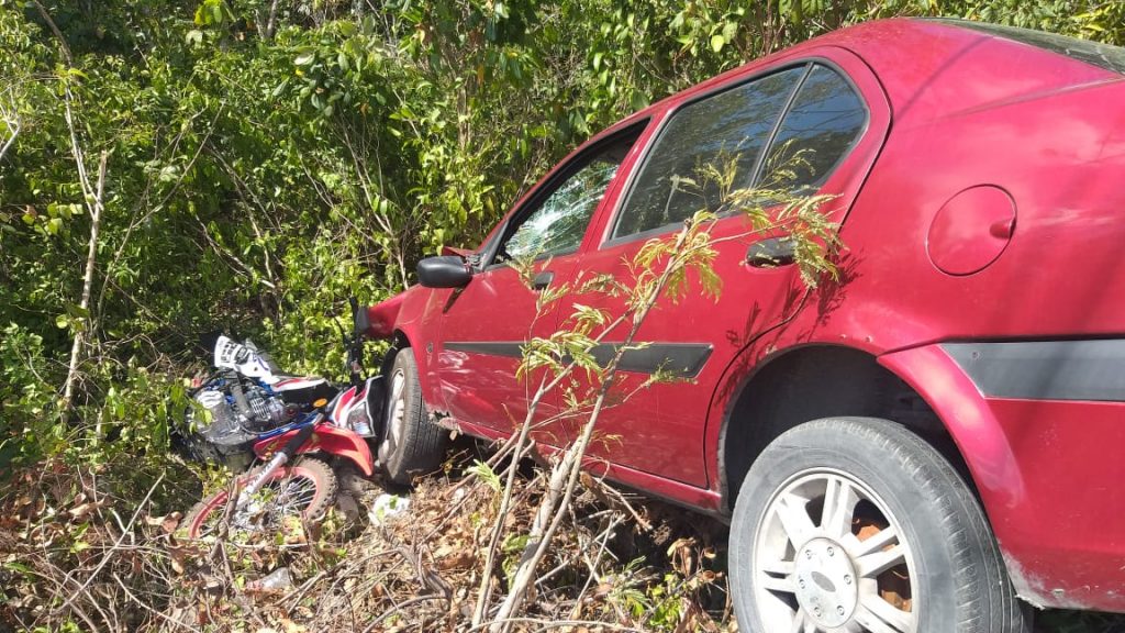 Según el reporte policiaco, el accidente se dio entre una moto y un auto cuando el chófer del carro rojo y dos jóvenes que iban en la moto, estos últimos salieron disparados sobre la unidad y el conductor del automóvil perdió el control estrellándose contra los arbustos de la orilla del camino.