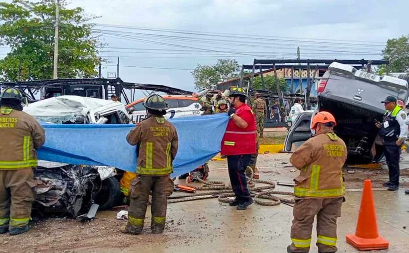 En la camioneta viajaban cinco trabajadores de la construcción, incluido el conductor, quienes fueron auxiliados por paramédicos y enviados a distintos centros hospitalarios. Por la fuerza del impacto, la unidad terminó volcada en dirección al aeropuerto de Cancún.