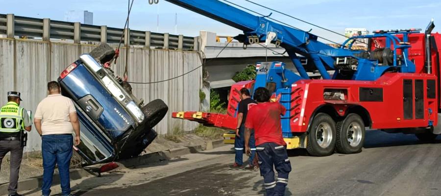 El primer percance ocurrió con dirección a Cárdenas, a la altura de la ranchería Anacleto Canabal Segunda Sección, donde una camioneta Nissan Frontier azul se salió del camino y terminó volcada en una cuneta del carril de baja velocidad. En el vehículo viajaban dos mujeres y un hombre, quienes resultaron ilesos. El incidente únicamente dejó daños materiales.