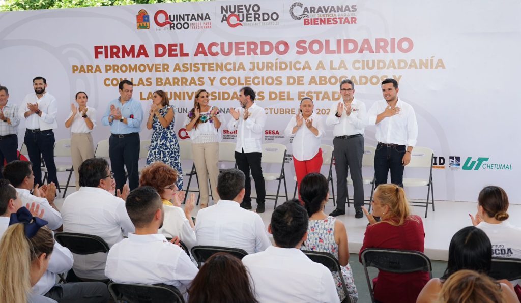 PODER Y CRÍTICA | REDACCIÓN | El Secretario de Bienestar, Pablo Bustamante Beltrán, acompañó a la Gobernadora Mara Lezama a la primera edición de las Caravanas de Justicia para el Bienestar, donde se llevó a cabo la firma de acuerdo solidario del Gobierno de Quintana Roo con barras y colegios de abogados del Estado, así como con universidades para promover la asistencia jurídica gratuita a la ciudadanía.