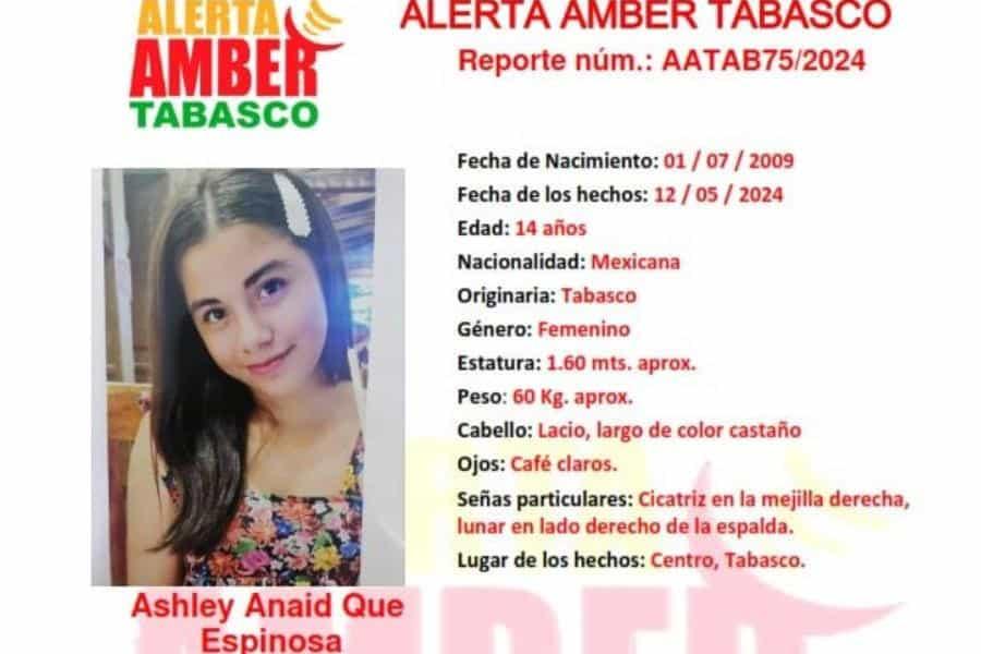 PODER Y CRÍTICA | REDACCIÓN | La Fiscalía General del Estado ha activado la Alerta Amber en Tabasco para buscar a Ashley Anaid Que Espinosa, una adolescente de 14 años de edad, quien fue vista por última vez en la madrugada del domingo 12 de mayo en el municipio de Centro.