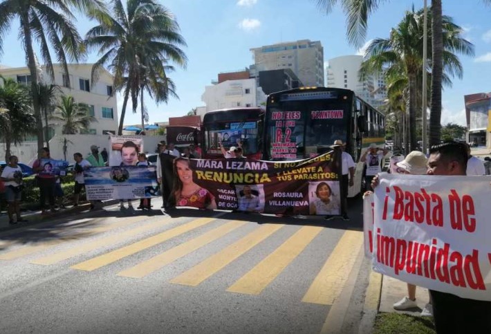 Estos ciudadanos, que incluyen a integrantes de la asociación “Verdad, Memoria y Justicia”, el colectivo “Quintana Roo, Hasta Encontrarles”, diversos conductores socios de Uber, e integrantes de otras agrupaciones, trajeron una lona de gran tamaño con el mensaje “Mara Lezama, si no puedes renuncia”, misma que atravesaron sobre los carriles de retorno del boulevard Kukulcán, frente a este inmueble, en el kilómetro 11.5 de la Zona Hotelera.