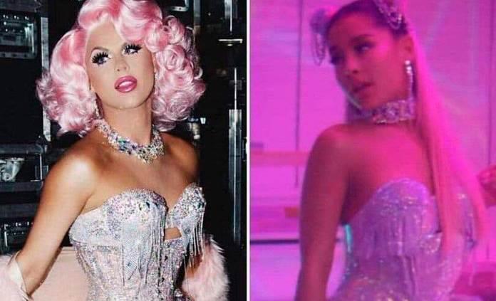 La drag queen utilizó sus redes sociales para mostrar una foto comparativa de ella y Ariana, en la que ambas lucen un vestido parecido, cabello rosa, collar y aretes similares.