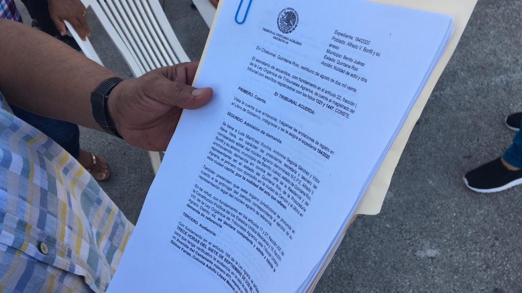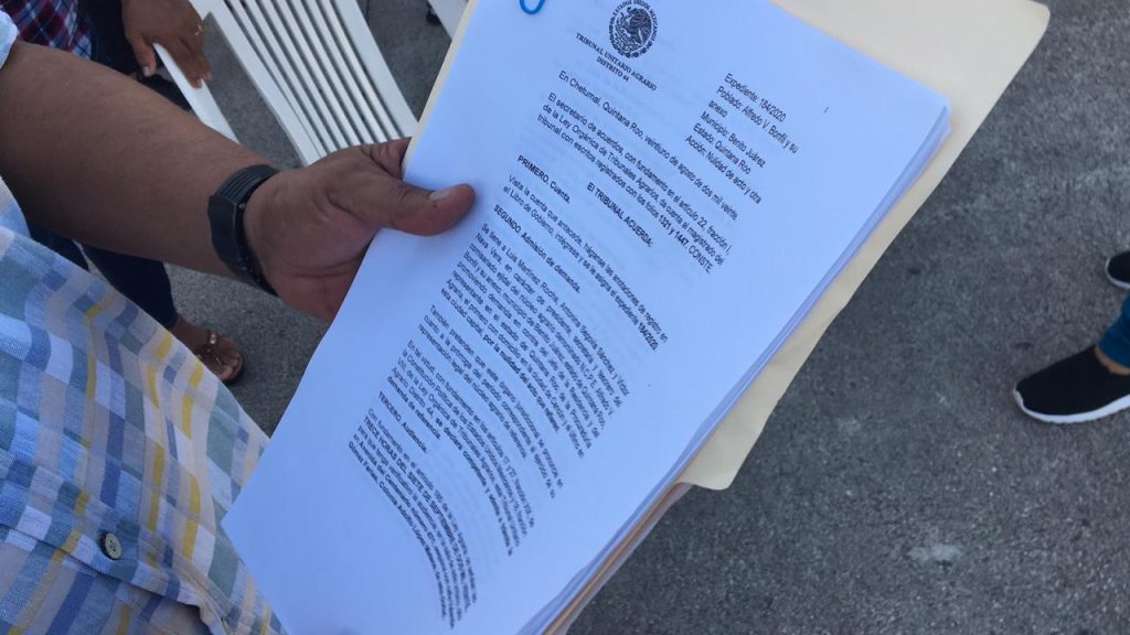 “Es el expediente 184/2020, del Tribunal Unitario Agrario distrito 44, con fecha 21 de agosto de 2020, un día antes que se celebrase la asamblea, se presenta el amparo por parte de los ex comisariados salientes”, detalla, donde ponen demanda contra del jefe de la residencia y del representante del estado de Quintana Roo de la Procuraduría Agraria por la nulidad del acto que se refiere.