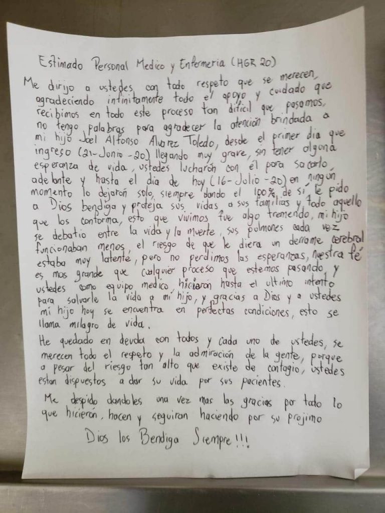 El padre de Joel entregó una carta escrita de su puño y letra, en la que agradece la labor de médicos, enfermeras, camilleros, intendentes y todos los involucrados en la atención a su hijo. Con esto dejó de manifiesto la capacidad profesional y humana de todo el personal del Hospital General Regional No. 20 del IMSS en Tijuana.