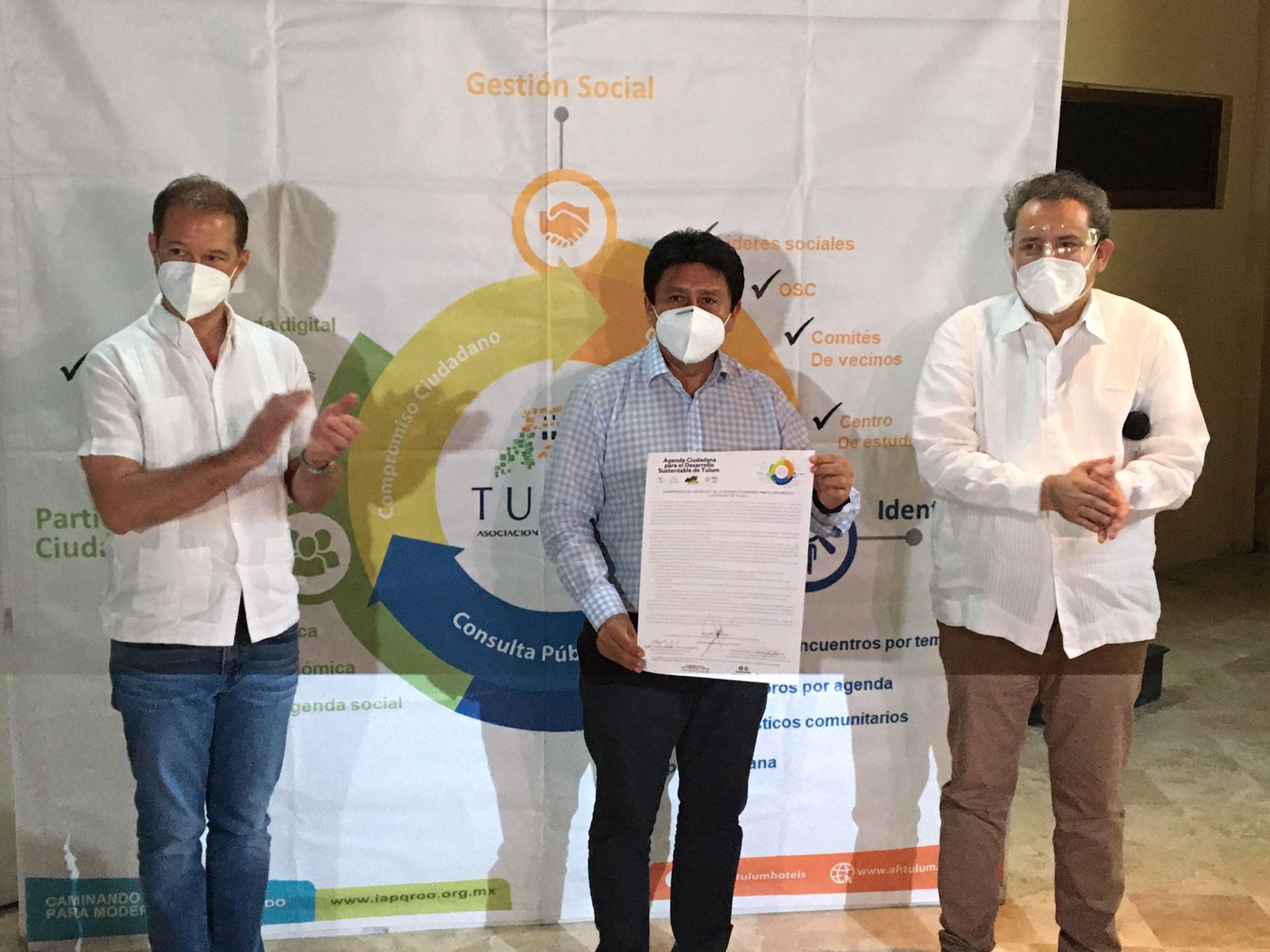 Víctor Mas Tah de la alianza “Va por Quintana Roo” felicitó al presidente de la Asociación de Hoteles por esta iniciativa de construcción de la Agenda, pues la mayor riqueza de Tulum es su naturaleza, por eso es importante cuidar el medio ambiente. Expresó que ya dieron pasos firmes y no pueden dar marcha atrás para lograr el Tulum que todos quieren, pero con acciones concretas. Que sus compromisos cumplirán con la aplicación de los Reglamentos para la sustentabilidad, por eso está convencido de firmar el documento de la Agenda Ciudadana.