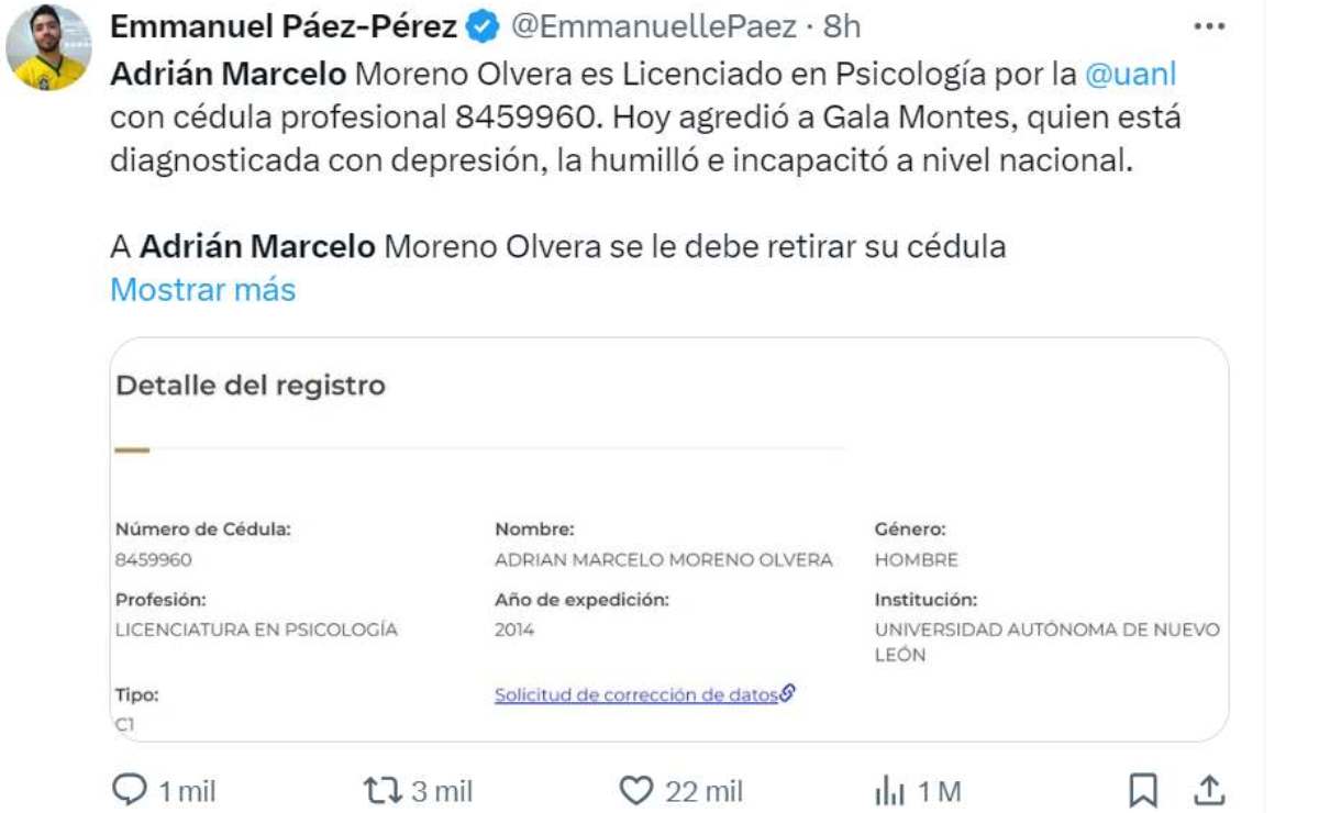 Usuarios de redes sociales están pidiendo una expulsión inmediata para Adrián Marcelo y cuestionan su título como psicólogo.