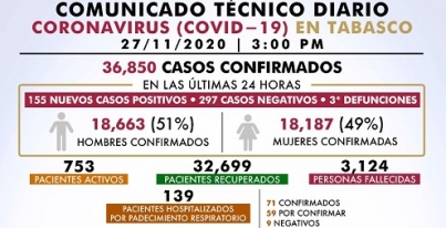 La dependencia dio a conocer que de acuerdo con el Comunicado Técnico Diario emitido este 27 de noviembre, el índice de positividad del coronavirus se incrementó en Tabasco, al pasar de 111 nuevos casos notificados el jueves, a 155 durante esta jornada.