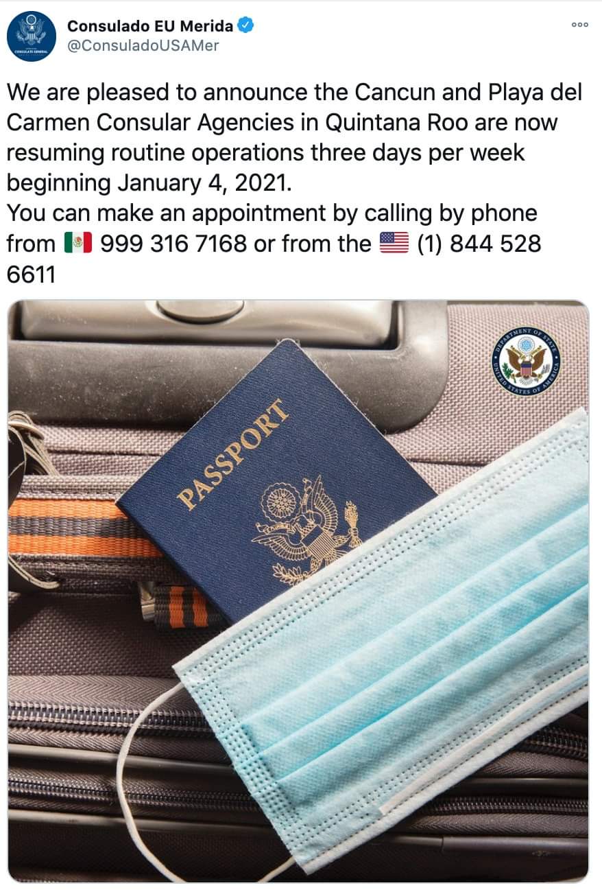 Cancún, Q. Roo, Martes 22 de Diciembre del 2020, poderycrítica.- El Consulado de Estados Unidos en Mérida anunció que Agencias Consulares de Cancún y Playa del Carmen reanudarán operaciones tres días a la semana a partir del 4 de enero de 2021.