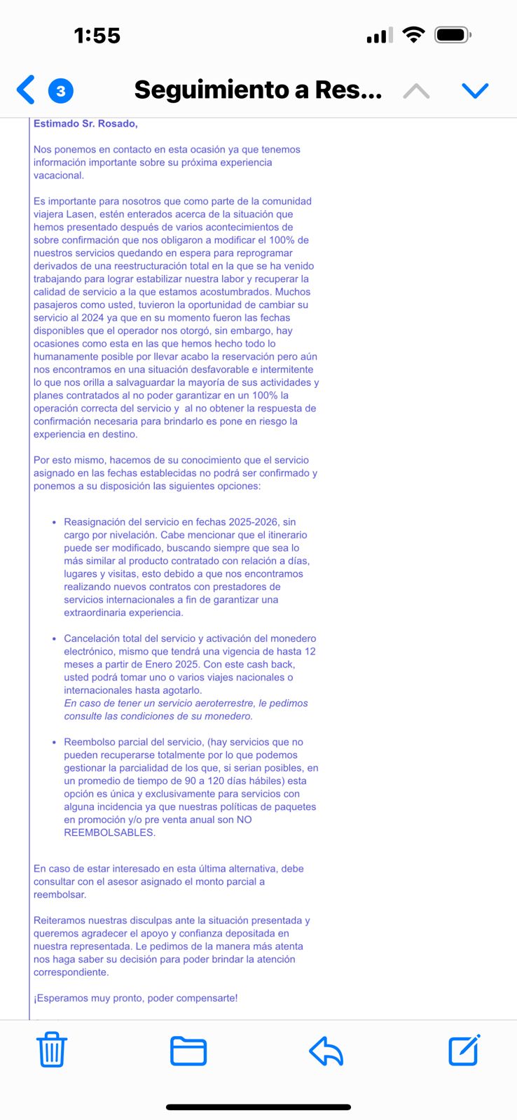 A partir de ahí le siguen dando prestextos y excusas para poder concretar su viaje. Le ofrecieron algunas opciones, pero tendría que pagar la diferencia, ahí es cuando se dio cuenta del fraude.