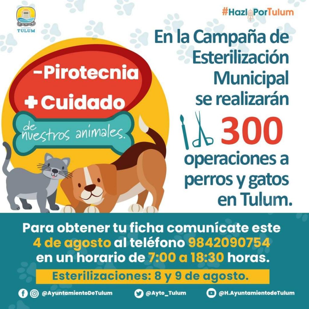 En las pasadas Fiestas Patrias nos comprometimos a destinar los recursos que no usamos en pirotecnia en esterilizaciones de mascotas, hoy les comparto que estamos a días de realizar la Campaña de Esterilización Municipal a 300 perros y gatos en Tulum, reiteró.