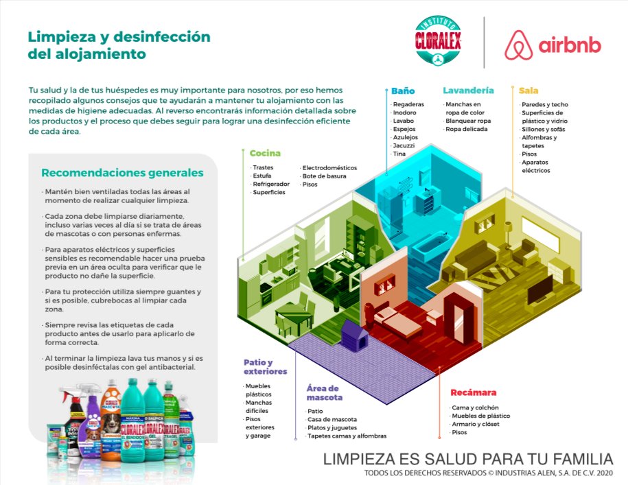 En el marco de una estrategia integral que tiene en México sobre limpieza y desinfección, donde se lanzó previamente su protocolo de limpieza con el aval nacional de la Facultad de Medicina de la UNAM y Funsalud, Airbnb suma el expertise de Instituto Cloralex para compartir recomendaciones avaladas por los expertos que permitan proteger a anfitriones, huéspedes y la población en general de una forma sencilla pero efectiva.