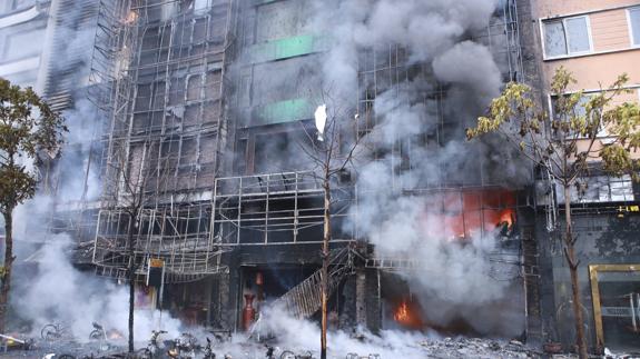 Las fotos mostraban columnas de humo saliendo del bar situado en un concurrido barrio residencial de la ciudad de Thuan An- mientras bomberos con grúas intentaban extinguir el fuego.