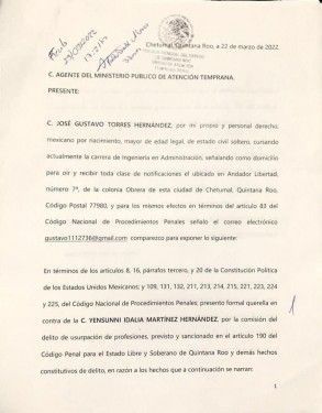 También la interpuso ante la Unidad de Atención Temprana de la Fiscalía General del Estado (FGE) bajo el número FGE/ QROO/ OPB/ 04/ 1838/ 2022.