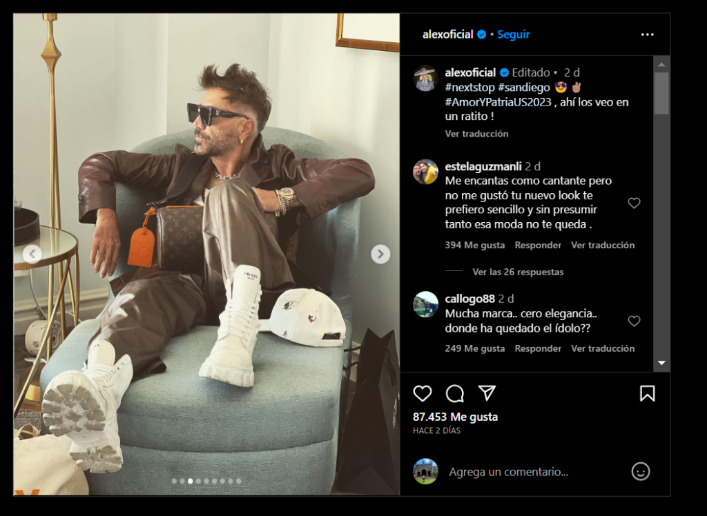 “Me encantas como cantante, pero no me gustó tu nuevo look te prefiero sencillo y sin presumir tanto esa moda no te queda”, “Cómo que le intento copiar a Robbie Williams, pero solo parece un jugador de las Chivas”, “Pura frivolidad”, “Chavoruco ugh… era mi amor platónico. Ahora sólo adoro su voz. Entre más viejo más ridículo”, fueron algunos comentarios.