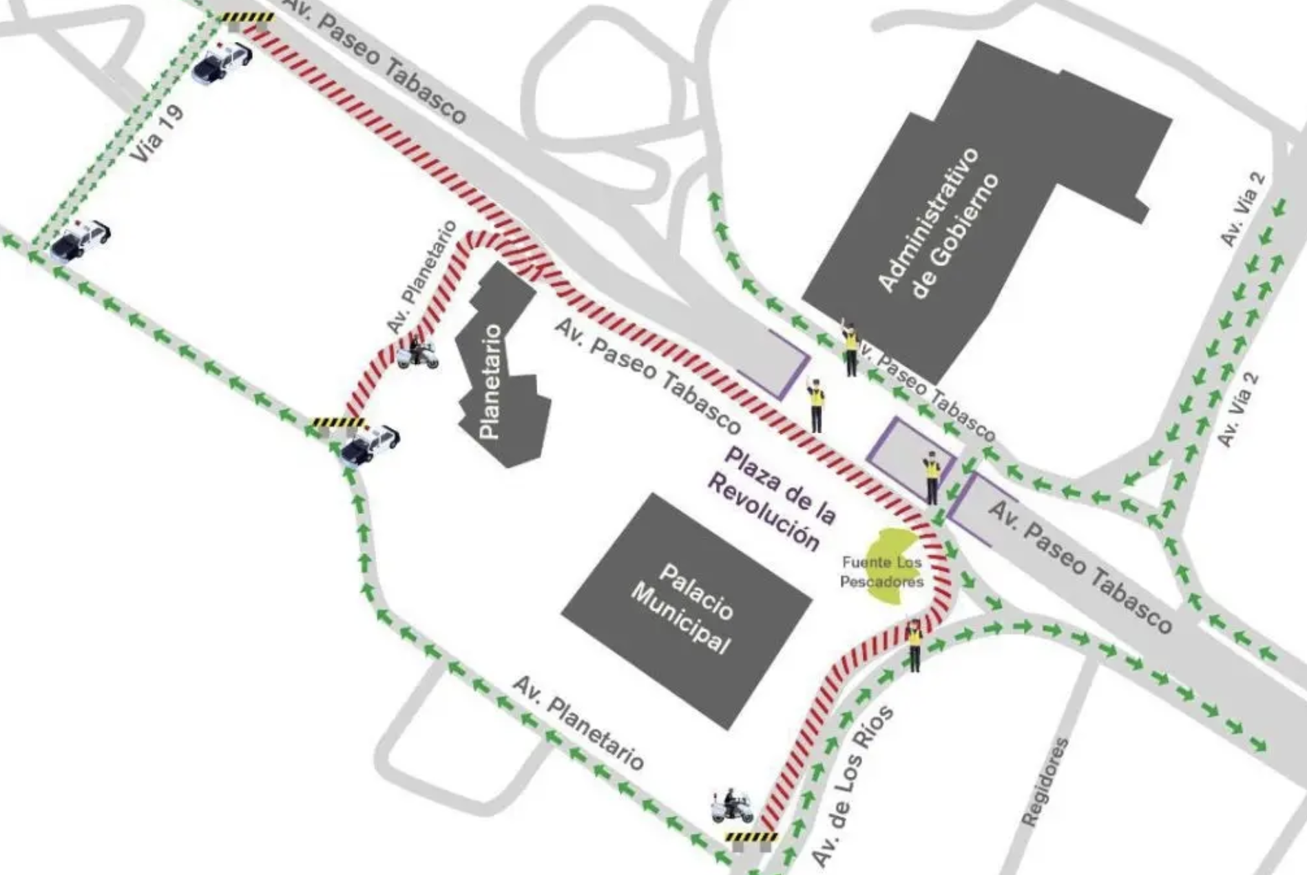 Se cerrará la circulación vehicular sobre el carril lateral de la Av. Paseo Tabasco, desde su intersección con la calle Vía 19 hasta la esquina con Av. Los Ríos. Además, se cerrará la Av. Los Ríos, en dirección desde Paseo Tabasco hasta la esquina con Av. Planetario.