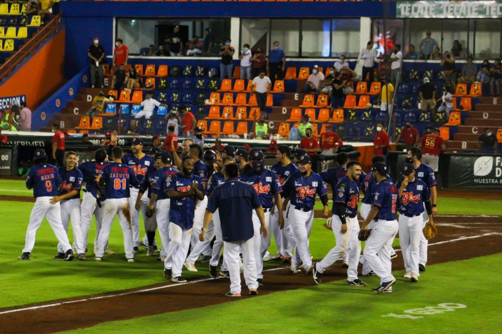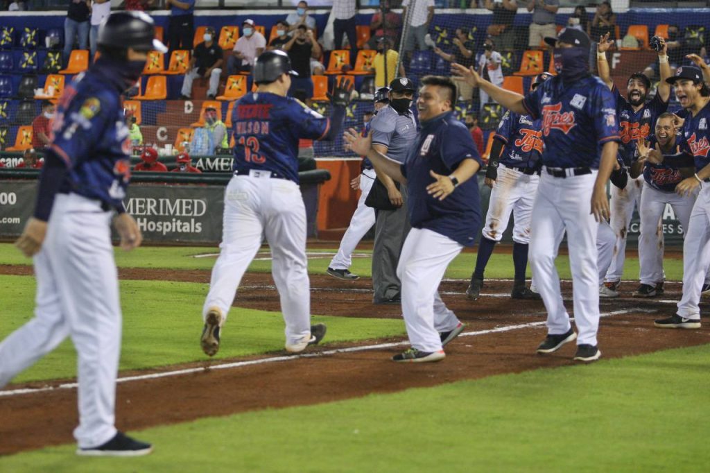Cancún, Q. Roo, viernes 28 de mayo de 2021, poderycritica.- El bateador emergente Alexis Wilson (1) se puso el traje de héroe en el cierre del noveno inning, al conectar homerun por todo el jardín izquierdo, llevándose por delante a Mario Cabrera, para darle la voltereta al juego y que los Tigres de Quintana Roo dejaran en el campo 3-2 a los Piratas de Campeche, para quedarse con el último de la serie celebrada en el estadio «Beto Ávila»