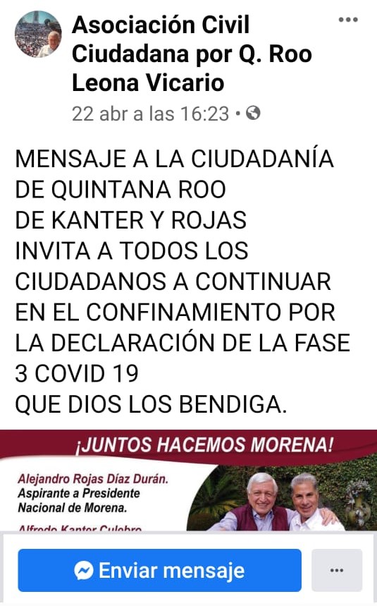 Cancún, Q. Roo, Domingo 03 de Mayo de 2020, poderycrítica.- El chiapaneco y fallido ex aspirante a la candidatura a gobernador de Chiapas hace apenas dos años, Alfredo Kanter Culebro, utiliza la emergencia sanitaria por el coronavirus para hacer Campaña proselitista en busca de la dirigencia estatal de Morena en Quintana Roo.