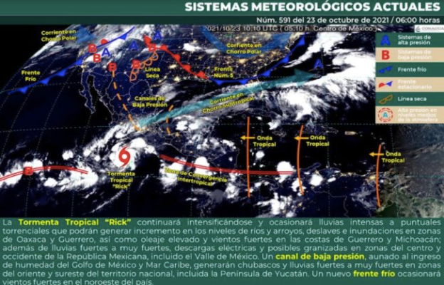 Por otra parte, un canal de baja presión extendido sobre el sureste del país, aunado al ingreso de humedad del Golfo de México y Mar Caribe, generarán chubascos y lluvias fuertes a muy fuertes en zonas del oriente y sureste del territorio nacional, incluida la Península de Yucatán. Finalmente, un nuevo frente frío se aproximará al noroeste del territorio nacional ocasionando vientos fuertes en dicha región.