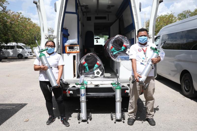 Por disposición del Gobernador Mauricio Vila Dosal, se realizó la entrega de 11 ventiladores, 24 tanques de oxígeno y 12 cápsulas aislantes, equipos que facilitarán la labor del personal ambulatorio durante la movilidad de personas con esta enfermedad.
