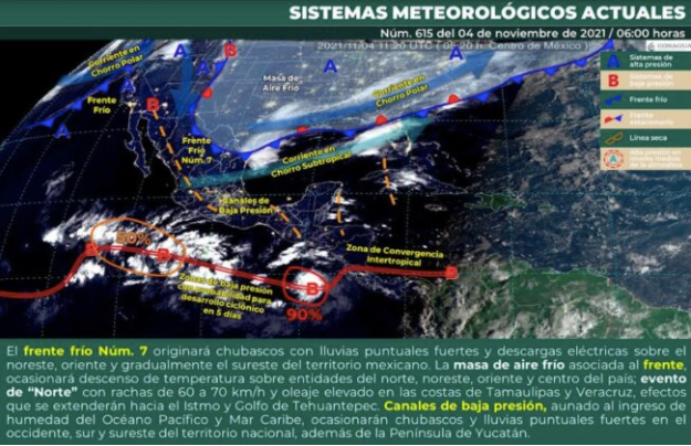 Agrega que canales de baja presión, aunado al ingreso de humedad del Océano Pacífico y Mar Caribe, ocasionarán chubascos y lluvias puntuales fuertes en el occidente, sur y sureste del territorio nacional, además de la Península de Yucatán.