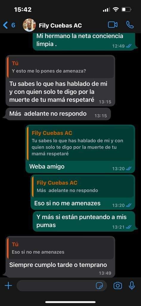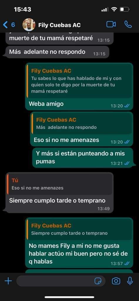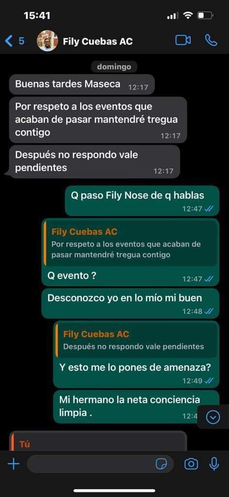 Ante lo exhibido en conversaciones se observa al esposo de la ex candidata amenazando al coordinador distrital del partido con un dicho temerario, por supuestamente haber hablado mal de él en ante algún personaje o ante los medios de comunicación.